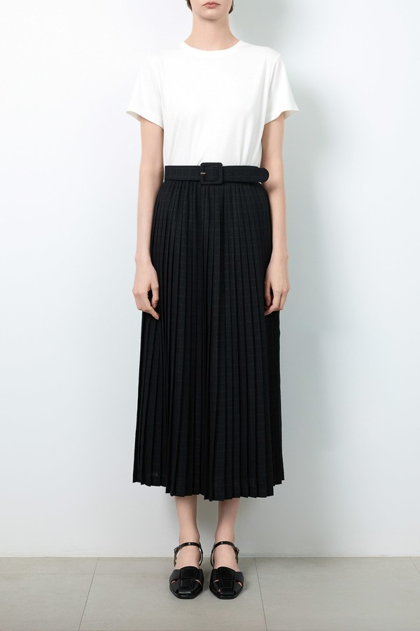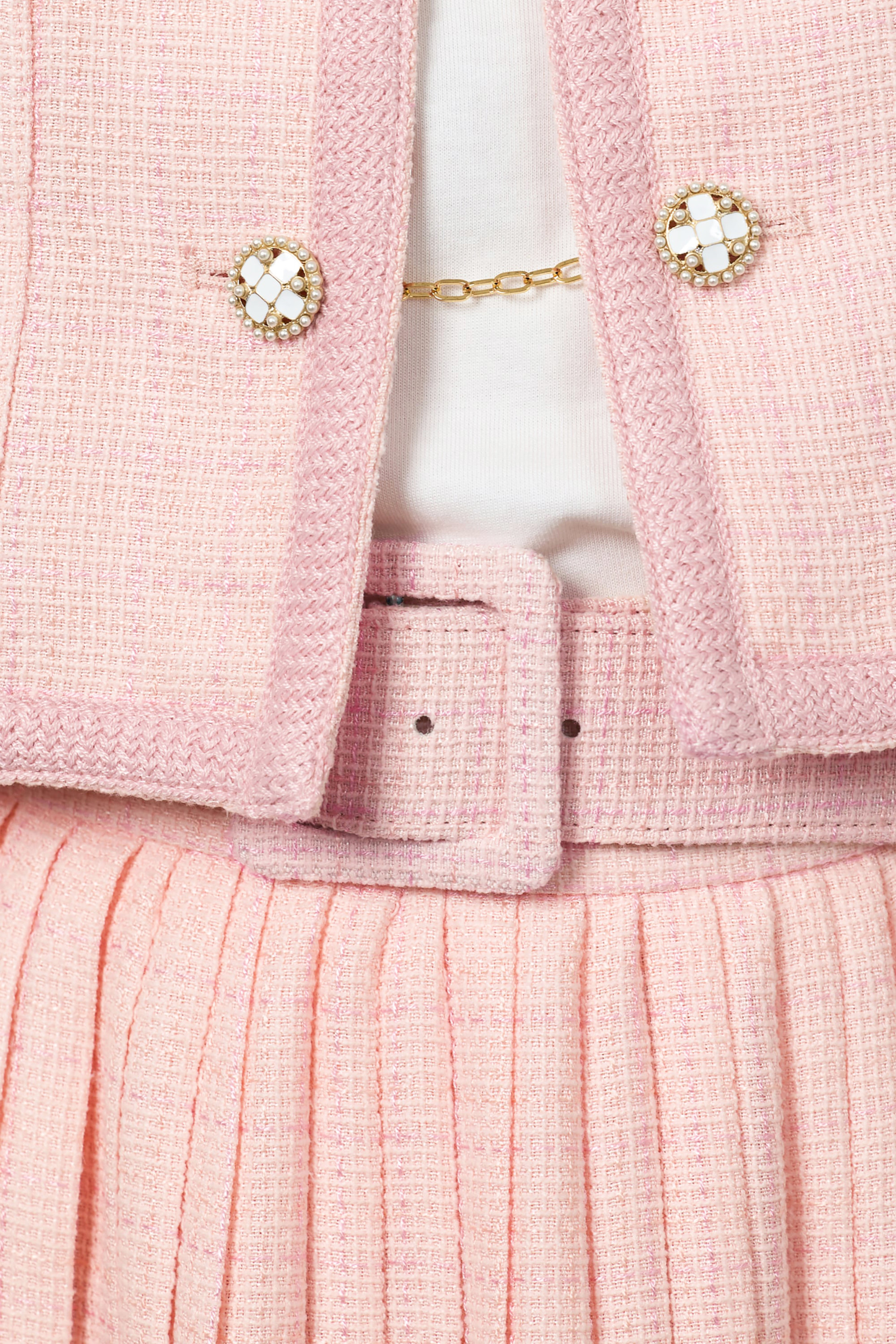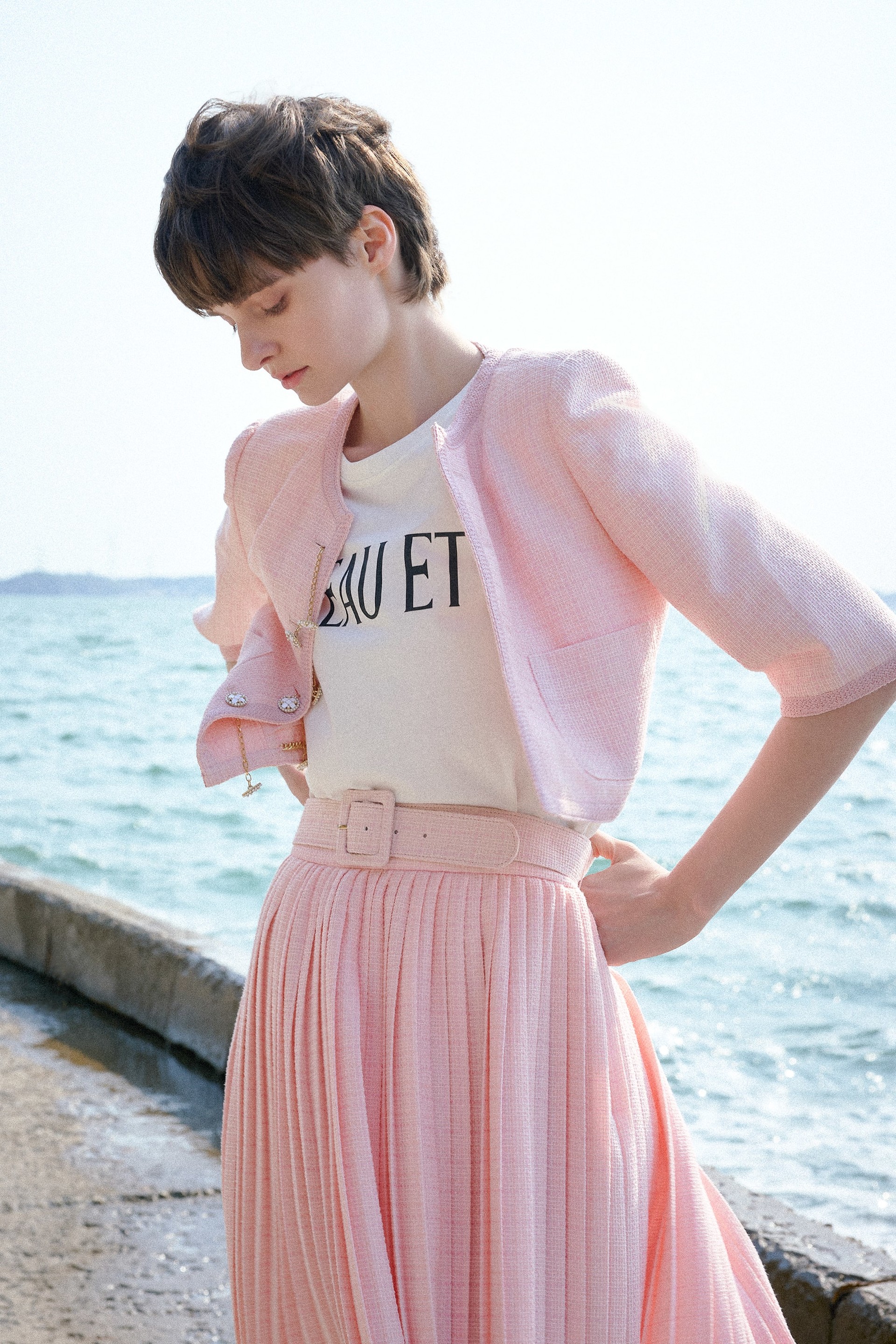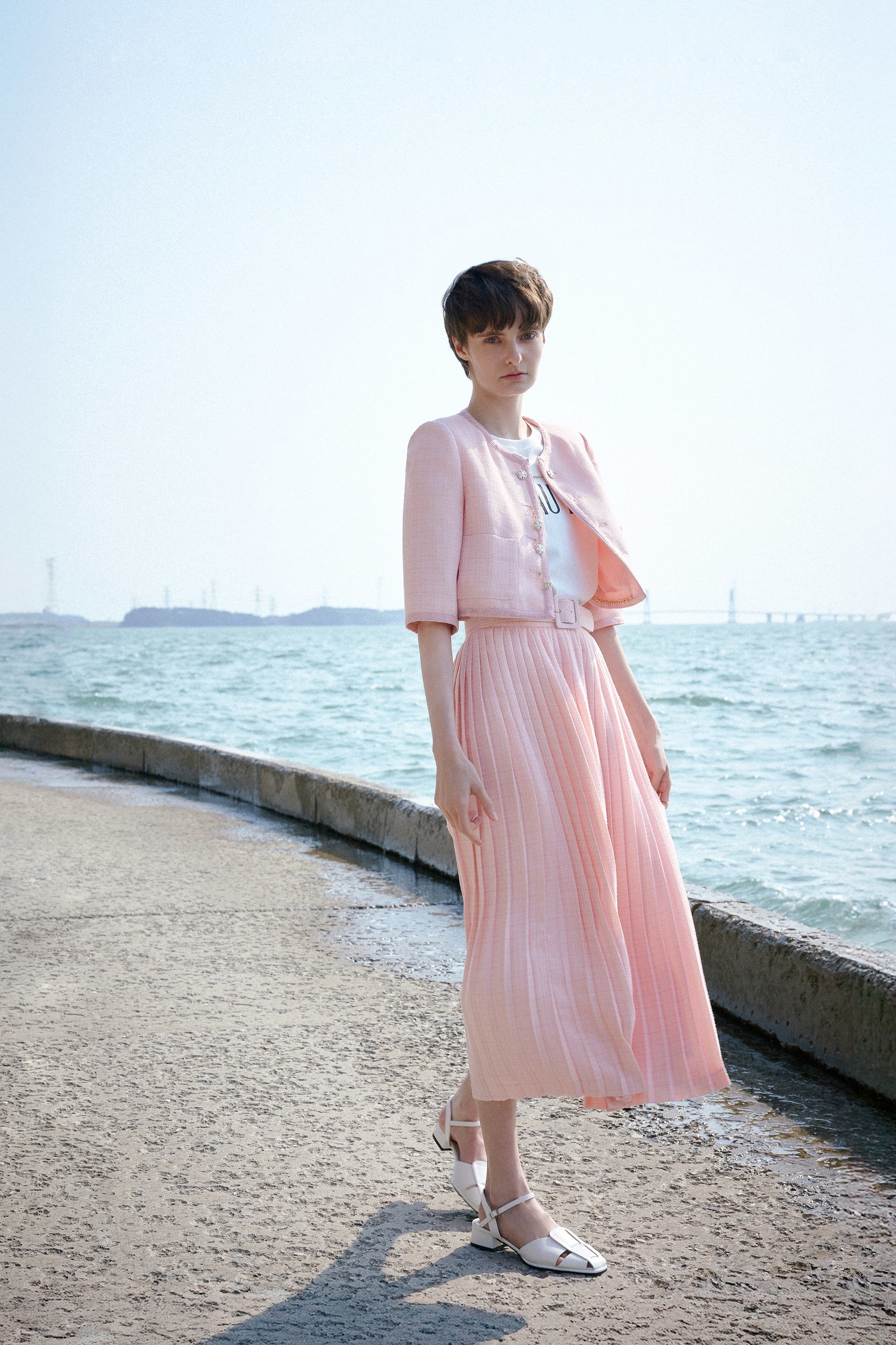 나이프 플리츠가 전체적으로 잡혀 우아하고 클래식한 실루엣의 하이웨이스트 스커트입니다. 제원단으로 제작된 벨트가 함께 구성되어 있습니다. 사이드 콘솔지퍼와 후크로 여미는 스타일입니다. 핑크 색상의 가볍고 신축성 없는 트위드 원단입니다. 미디 기장이며, 안감이 있어 비침을 막아 편안한 착용을 도와줍니다.